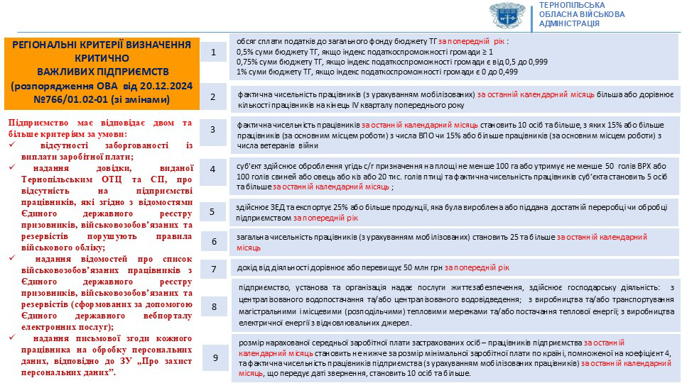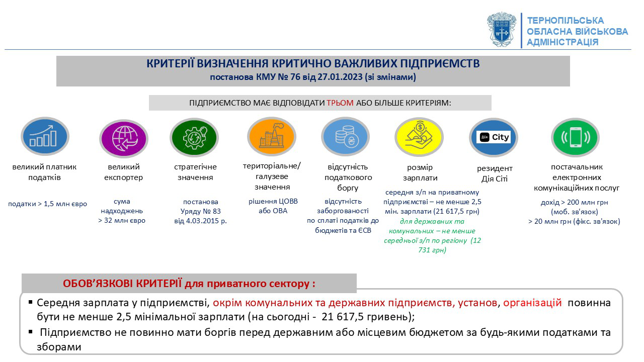 ДОРОЖНЯ КАРТА отримання статусу критично важливого підприємства/установи/організації для функціонування економіки та забезпечення життєдіяльності населення в особливий періодВажливо! Відповідно до норм чинного законодавства статус критично важливих не надається фізичним особам-підприємцям.КРОК 1. Ознайомтесь з нормативно-правовими актами:КРОК 2. Оберіть не менше трьох критеріїв, затверджених Постановою Уряду від 27 січня 2023 р. №76 (зі змінами)*:КРОК 3. Оберіть не менше двох регіональних критеріїв, затверджених розпорядженням Тернопільської обласної військової адміністрації від 20.12.2024 № 766/01.02-01 (зі змінами):КРОК 4. Оберіть не менше двох показників із КРОК 2, якщо ви відноситись до:- підприємства, установи та організації паливно-енергетичного комплексу, підприємства, що обслуговують об’єкти, внесені до секторального переліку об’єктів критичної інфраструктури сектору системи життєзабезпечення, управителі багатоквартирних будинків - юридичні особи (суб’єкти господарювання), казенні підприємства пробірного контролю та підприємства, установи, організації, які забезпечують надання послуг і виконання робіт з експлуатації та комплексного обслуговування майна органів державної влади;